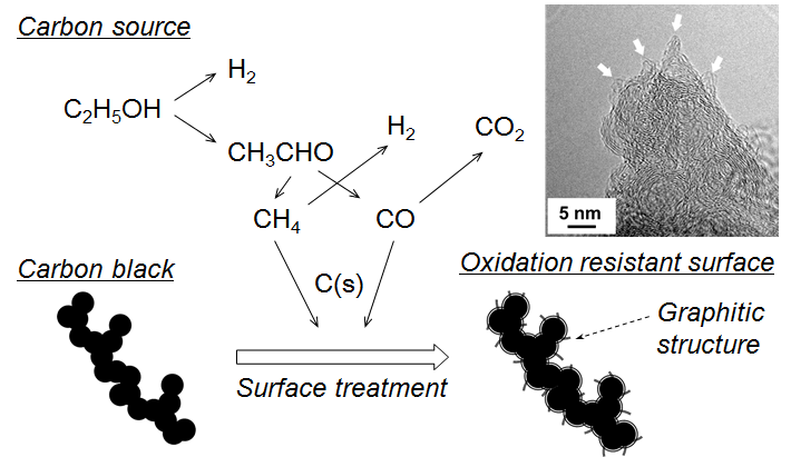 “Oxidation-resistant graphitic surface nanostructure of carbon black developed by ethanol thermal decomposition” Y. Kameya, T. Hayashi, M. Motosuke Diamond and Related Materials (2016) [link]