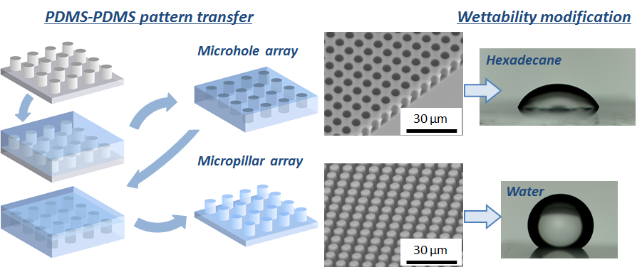 “Wettability modification of polydimethylsiloxane surface by fabricating micropillar and microhole arrays” Y. Kameya Materials Letters (2017) [link]
